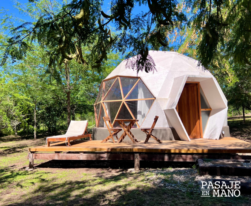 Este glamping está ubicado en uno de los pueblitos más antiguos de Córdoba, a 130 kilómetros de Capital. Cuenta con 6 domos que tienen ropa de cama, baño y deck privados. Está dentro de un predio de 23 hectáreas donde hay una pileta de agua natural que proviene del río Amboy y diferentes actividades como trekking, bicicletas, juegos de mesas y hasta espacio para masajes. El servicio es all inclusive: desayuno, almuerzo, picnic, cena y hasta picada.